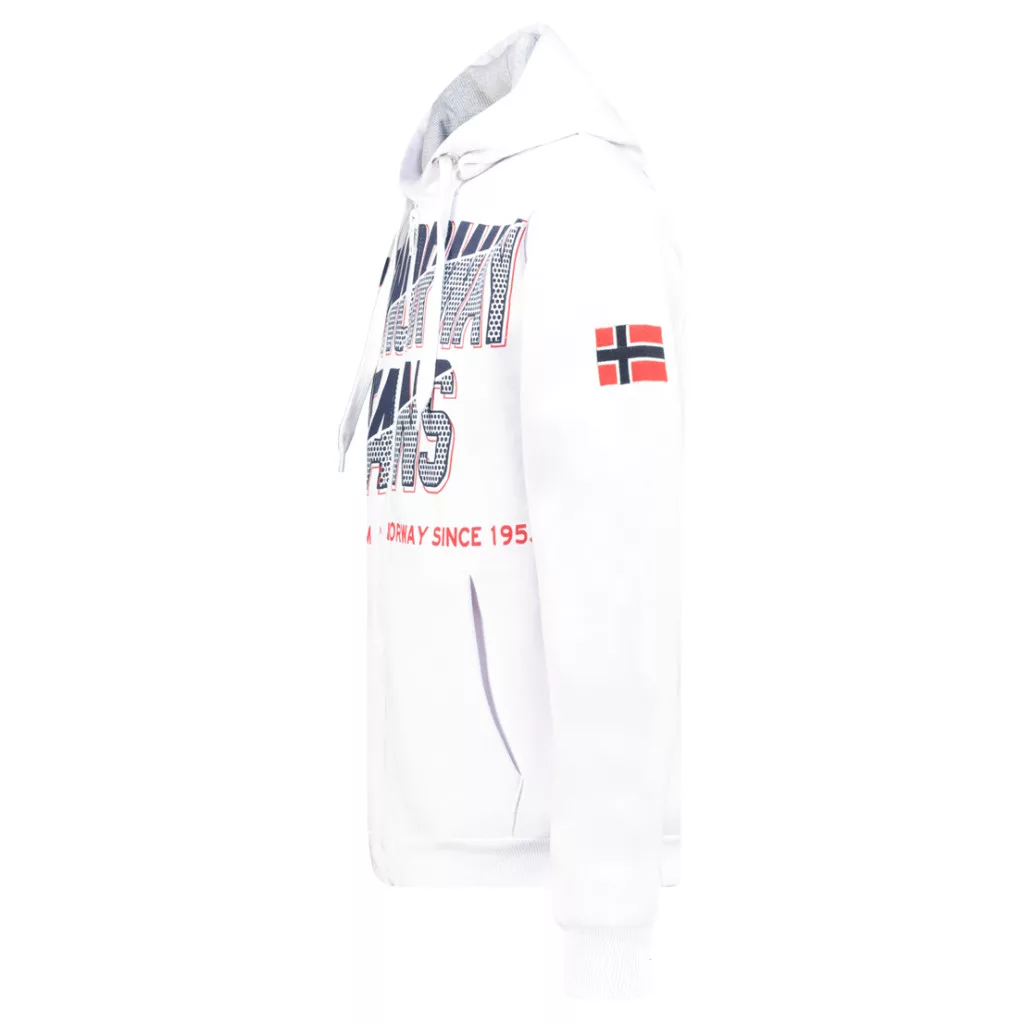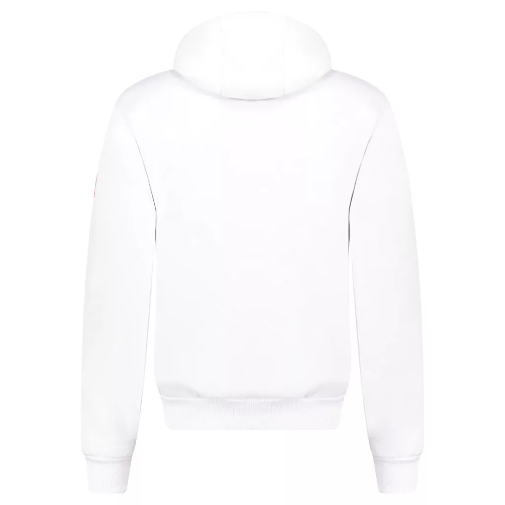 65% pamutból és 35% poliészterből készült, így puha és jól szellőző viseletet biztosít, tökéletes a mindennapokra. A középen futó cipzár megkönnyíti a felvételt, a húzózsinóros kapucni pedig kényelmes, testre szabható illeszkedést garantál. Az elején található minta és az ujján elhelyezett zászló modern, dinamikus megjelenést kölcsönöz a pulóvernek, ideális egy sportos, hétköznapi outfit kiegészítéséhez.
