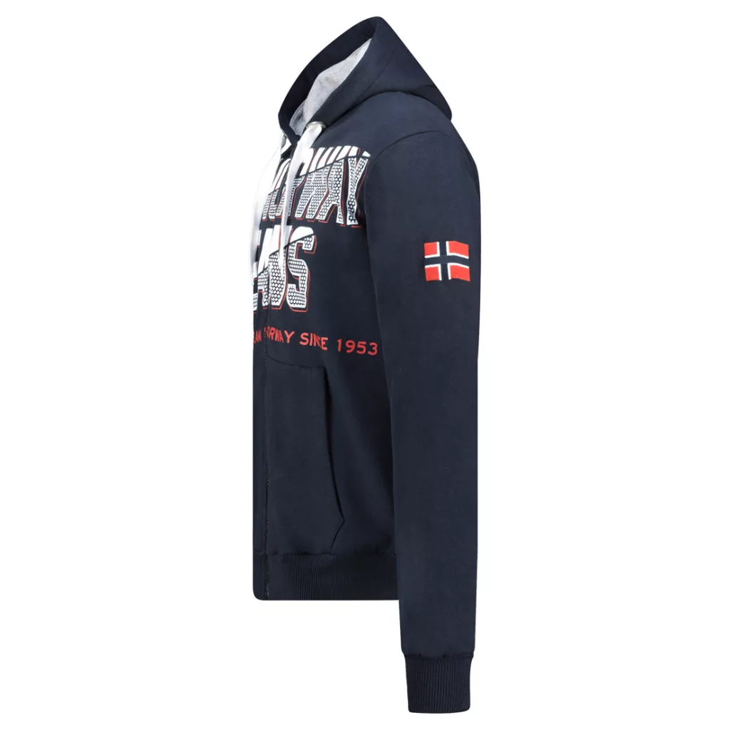65% pamutból és 35% poliészterből készült, így puha és jól szellőző viseletet biztosít, tökéletes a mindennapokra. A középen futó cipzár megkönnyíti a felvételt, a húzózsinóros kapucni pedig kényelmes, testre szabható illeszkedést garantál. Az elején található minta és az ujján elhelyezett zászló modern, dinamikus megjelenést kölcsönöz a pulóvernek, ideális egy sportos, hétköznapi outfit kiegészítéséhez.
