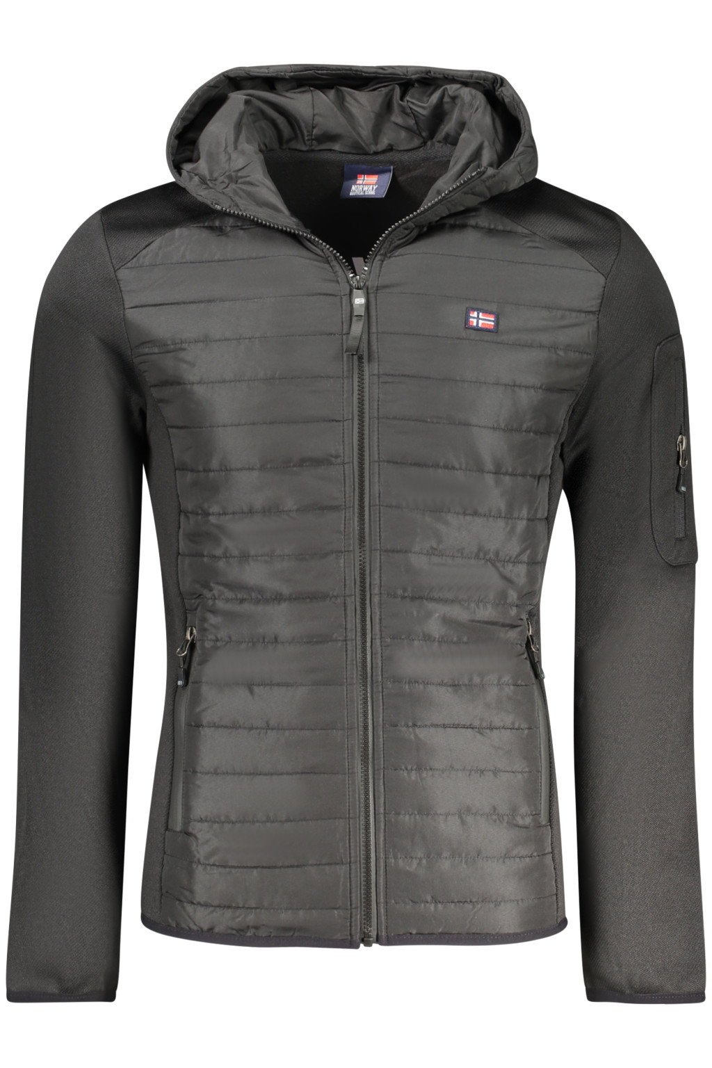HOSSZÚ UJJÚ KAPUCNIS DZSEKI, 2 KÜLSŐ ZSEBEL, 2 BELSŐ ZSEBEL, 1 ZSEB A BAL KARON, KONTRASZ RÉSZLETEKKEL, CIPZÁRRAL, APPLIKÁCIÓVAL, LOGÓVAL