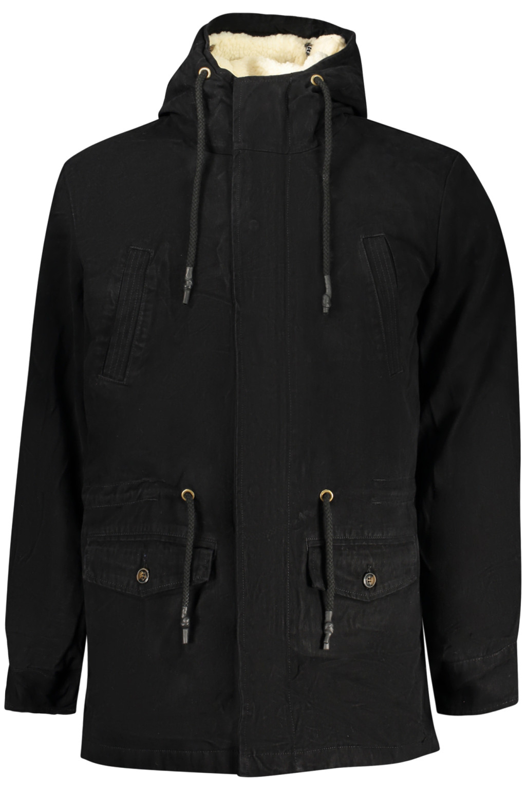 HOSSZÚ UJJÚ KABÁT KAPUCNIVAL, PARKÁVAL, 4 KÜLSŐ ZSEBEL, KIVEHETŐ JUHHATÁSÚ SZŐRMÉVEL BELÜL, CIPZÁRRAL, PATTANOKKAL, GOMBOKKAL ÉS HÚZÓZSINÓRRAL A DERÉKEN, LOGÓVAL