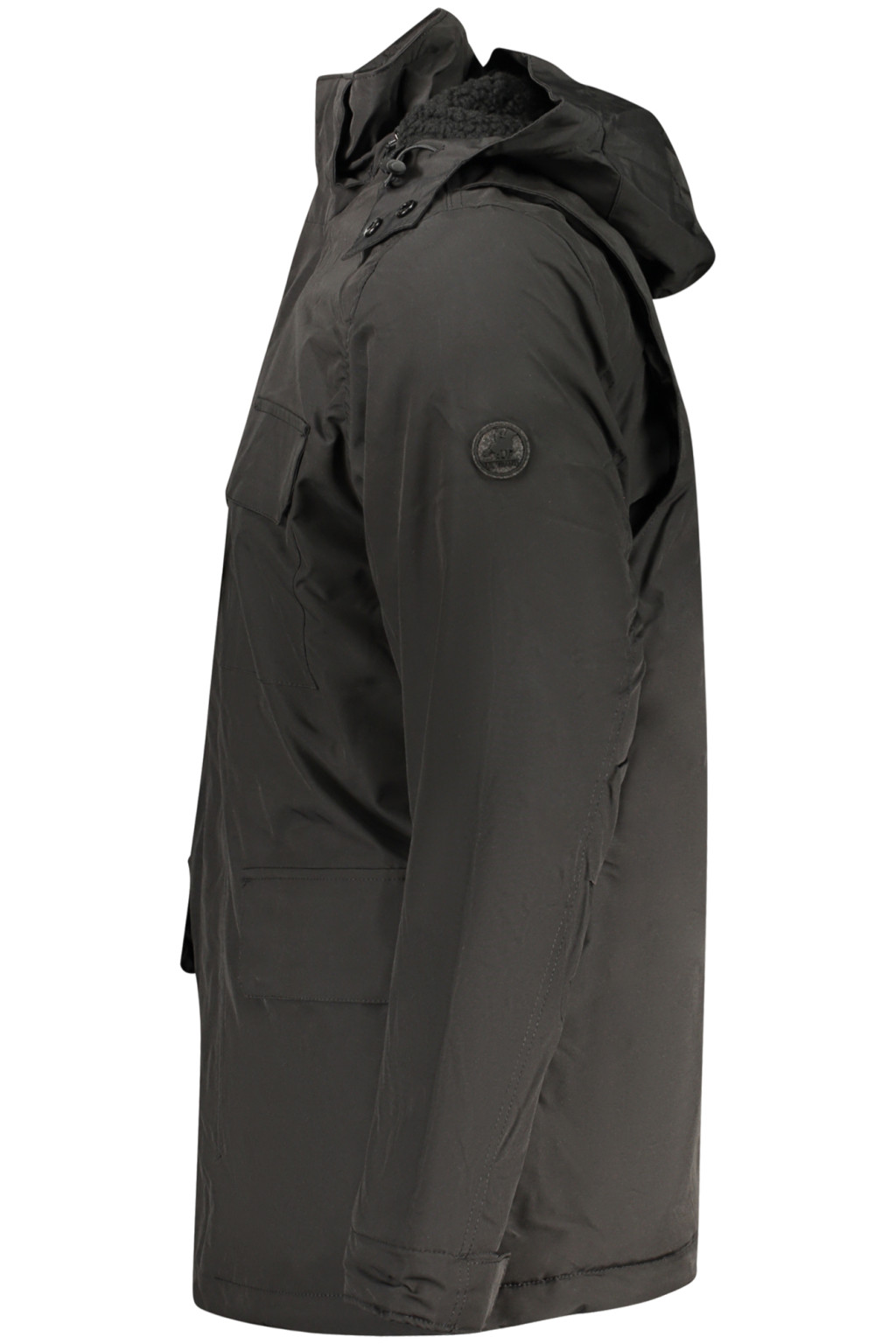 HOSSZÚ UJJÚ KABÁT LEVÉLHETŐ KAPUCNIVAL, PARKÁVAL, 4 KÜLSŐ ZSEBEL, 1 BELSŐ ZSEBEL, JUHCSÍN HATÁSÚ SZŐRMÉVEL BELÜL, CIPZÁRRAL, PATTANOKKAL, APPLIKÁLÁSSAL, LOGÓVAL