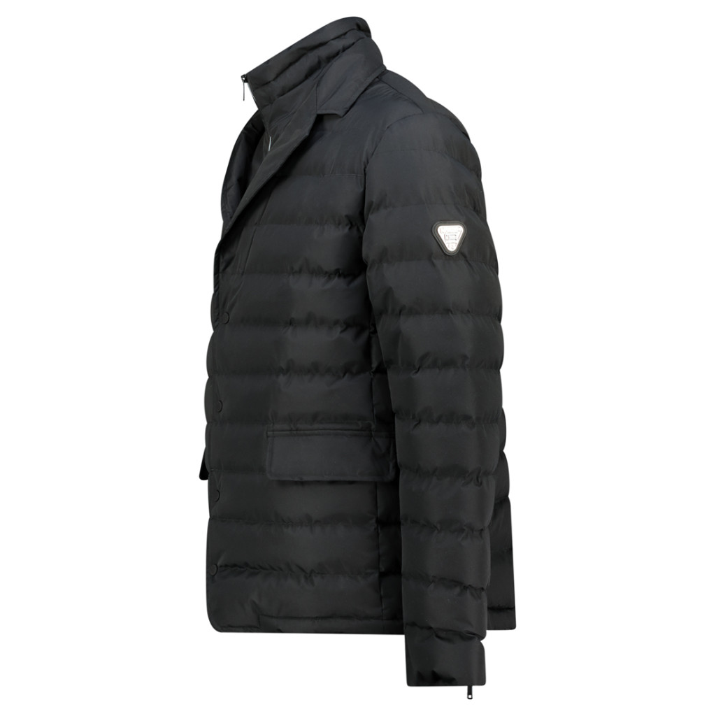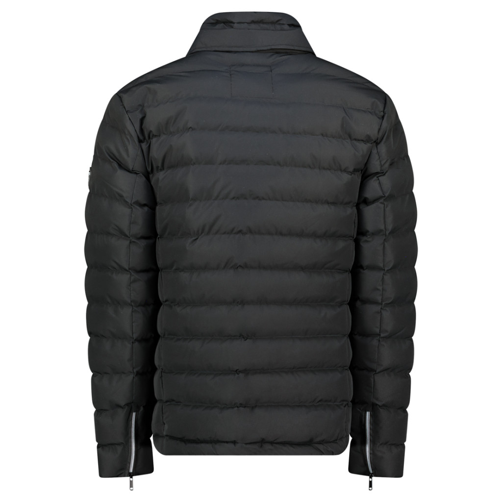Kényelmes, állógalléros, steppelt dzseki. Dupla elülső záródás, fröccsöntött cipzár és gombok. Elülső zsebek, jelvény az ujjon.