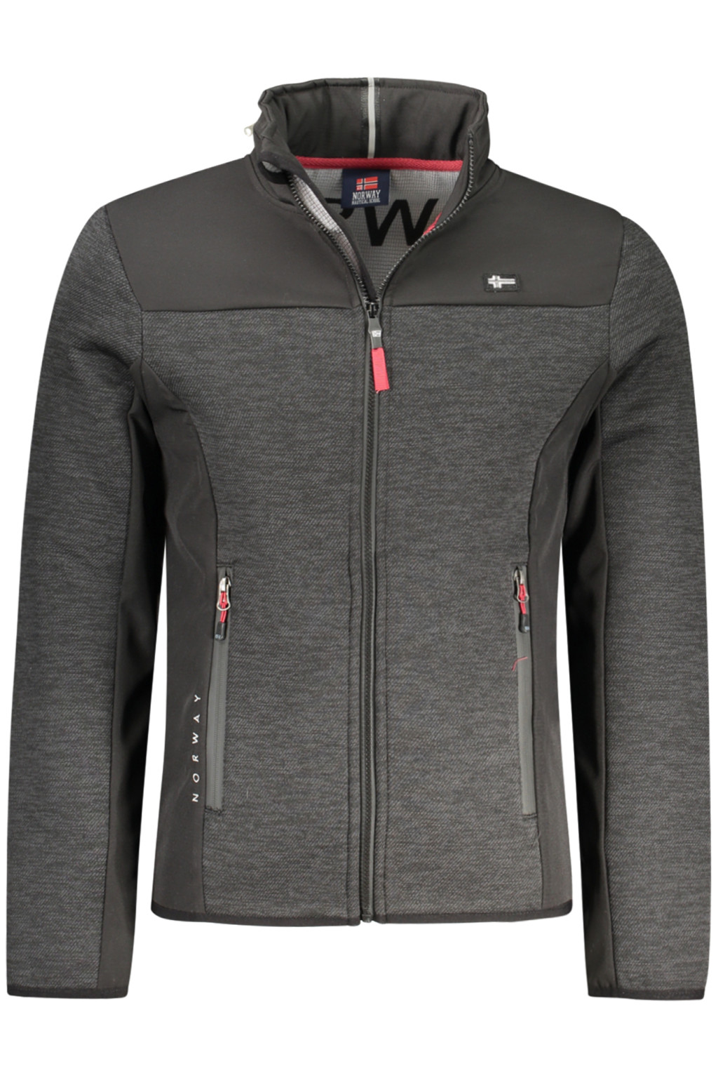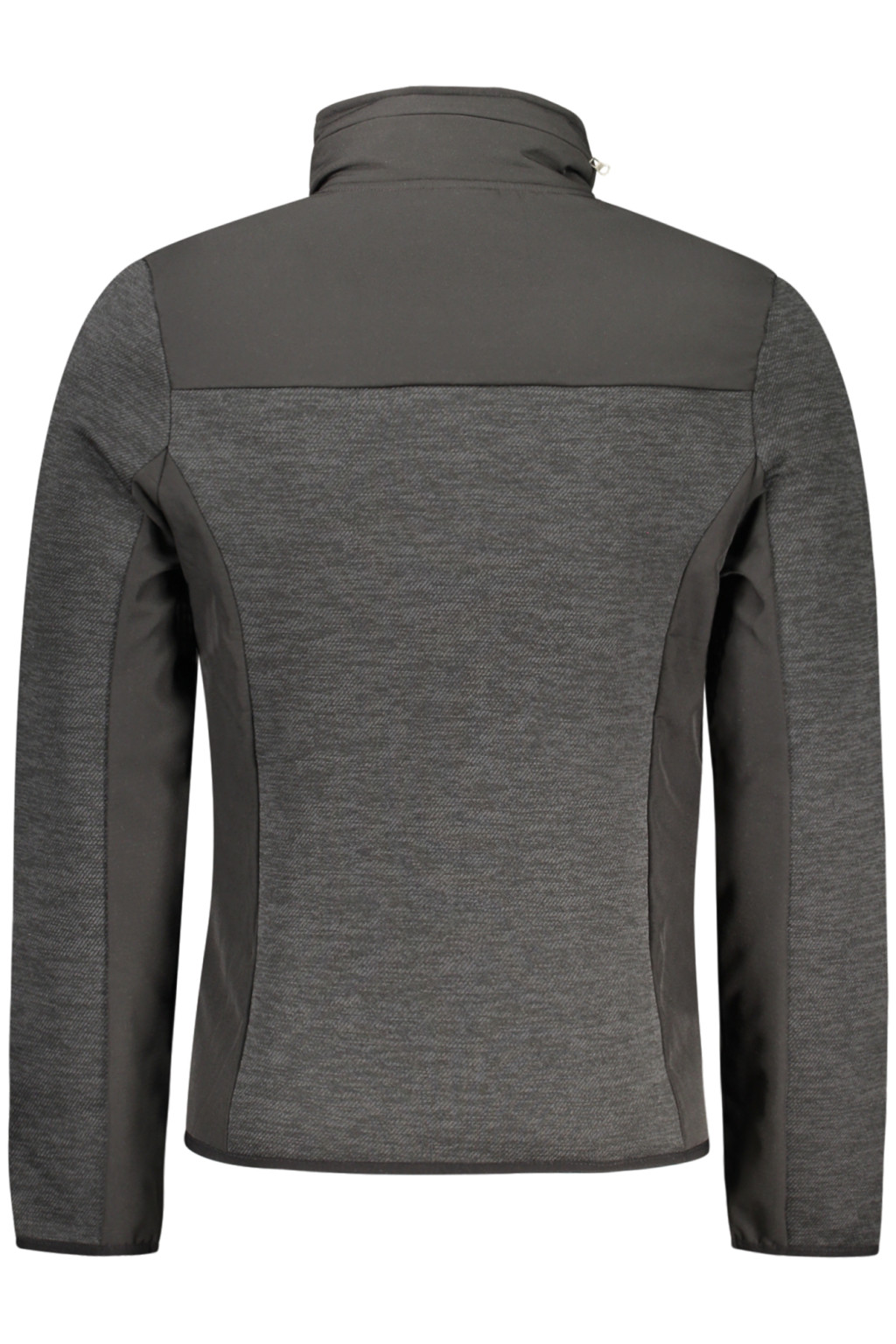 HOSSZÚ UJJÚ KABÁT LEVEHETŐ KAPUCNIVAL, 2 BELSŐ ZSEBEL, 2 KÜLSŐ ZSEBEL, KONTRASZT RÉSZLETEKKEL, CIPZÁRRAL, SZÜRKE APPLIKÁCIÓVAL, LOGÓVAL