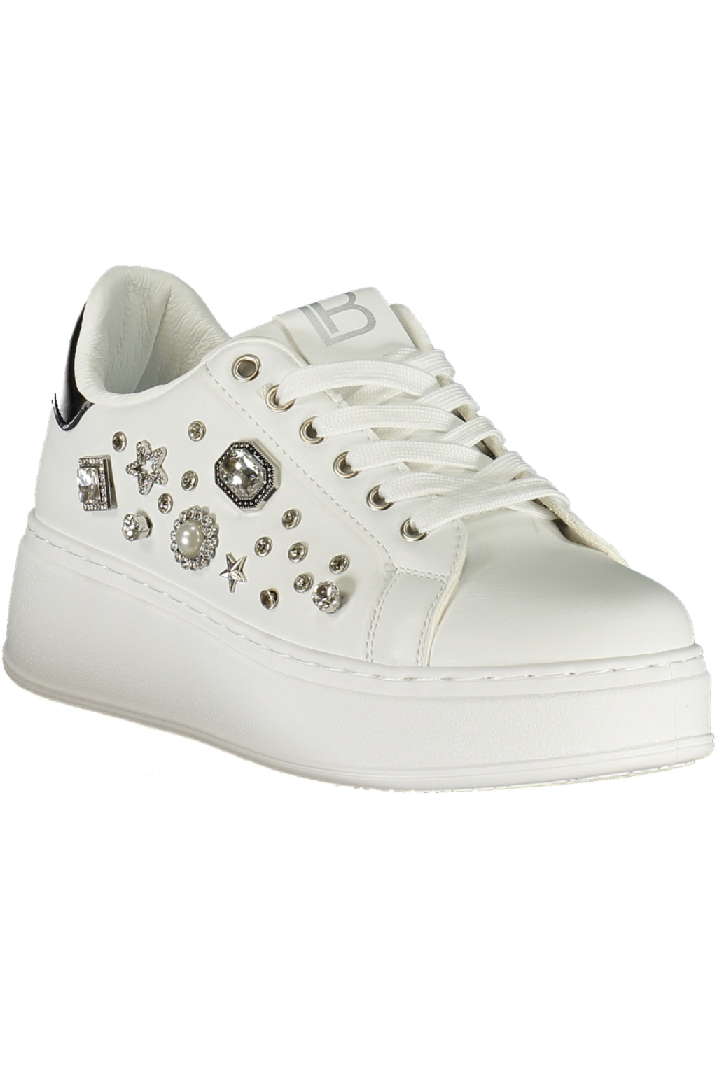 Fűzős sportcipő kontrasztos fekete részletekkel, strassz díszítéssel és logóval